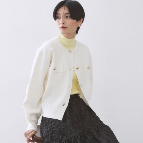 ・大きめの金釦がポイントのほどよい厚みのクルーネックカーディガン。
