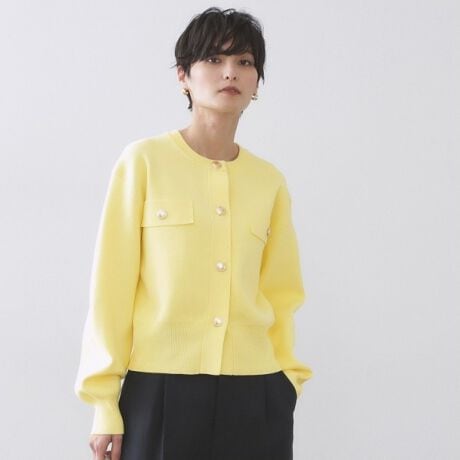 ・大きめの金釦がポイントのほどよい厚みのクルーネックカーディガン。