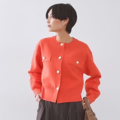 ・大きめの金釦がポイントのほどよい厚みのクルーネックカーディガン。