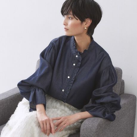 ・フリルデザインとキャンディスリーブデザインが華やかなデニムブラウスです。