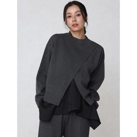 ・大胆な斜めカットデザインがトレンド感溢れるニットトップス。