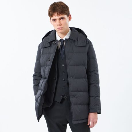 WELLINGTON(ウェリントン)のフード取り外しデザインをベースにしたステンカラーコートをよりカジュアルでも着やすいよう着丈を設定したショートタイプ。ダウン分量に拘り、ウエストより上側は防寒と高級感を出す為、ダウン分量を多めに設定し、裾側はハネ防止やコートのシルエットをキレイに見せる為、ダウン分量を少なく調整しています。