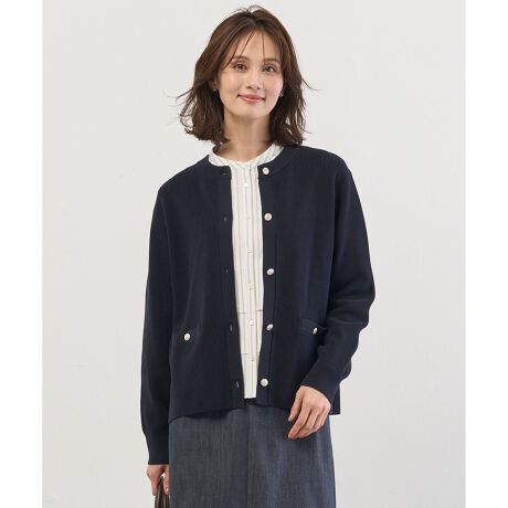 表情のある編地と紋章メタル釦がポイントのカーディガン。畦目がきれいなミドルゲージの編地が、クラシカルな雰囲気を演出します。アクセントとして、フロントには紋章を刻印したメタルボタンを施し、トラッドなムードを高めました。暖かな季節には軽アウターとして、寒い時期にはコートインでももたつかず着用でき、着こなしの幅が広がるアイテムです。カラーは、柔らかく女性らしいベージュ(#033)、爽やかな春色のスモーキーミント(#062)、上品で落ち着いた印象のネイビー(#075)の3色展開です。