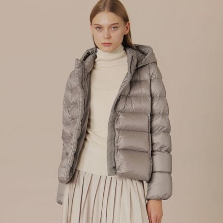 [型番:G5F04761__]【着用推奨シーズン:秋・冬】<素材説明>繊細で柔らかく発色性の良いナイロンを使用した、素材の軽さ感じていただける生地です。<デザインポイント>ショート丈のライトウエイトのダウンコートです。スカートやワンピース、ワイドパンツとのスタイリングに活躍します。フードを外すとスタンドカラーのスッキリとしたダウンとしても楽しめます。裾と袖口をふっくら仕立ててあるのもポイントです。