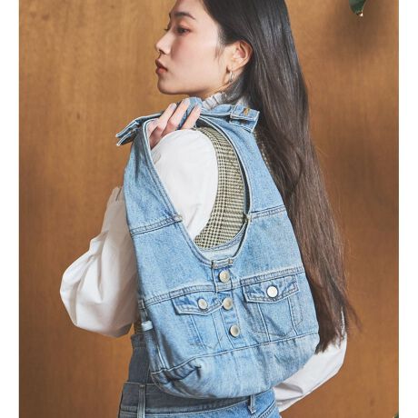 デニムジャケットのアイコニックなデザインを大胆にバッグへと昇華させたデニムバッグ。最大のこだわりは、ショルダー部分がジャケットの袖になっている点。背面には便利なアウトポケットを配し、スマートフォンなどを簡単に取り出せる実用性も確保。さらに、袖部分をリボンのように結んで肩掛けに、カフス部分を繋げれば斜め掛けも叶う2WAY仕様で、着こなしに合わせて様々な表情を楽しめます。