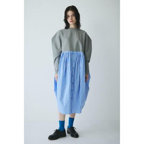 異素材ドッキングのワンピース上部はHeRIN定番のポンチ素材を使用し、下部分にはシャツ生地を使用しています。ポンチ素材は程よいハリ感があり、袖のディテールなど細部まで綺麗に見せてくれます。切り替え部分はたっぷりとタックを入れているため、ふわっとしたシルエットが演出できています。1枚で完成する嬉しいアイテムです。ドッキングシャツドレス[注意事項] ※画像の商品はサンプルです。実際の商品と仕様、加工が若干異なる場合があります。 ※画像の商品は光の照射や角度、お使いのモニター環境により、実物と色味が異なる場合がございます。 ※着用、お取り扱いの際は、アテンションタグをご確認ください。