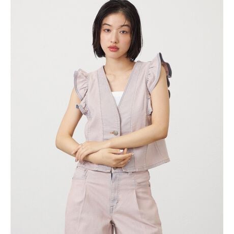 前後2WAYで着用が叶う、フリルスリーブビスチェ。袖のフリルデザインが、着こなしに華やかなアクセントを添えます。肩幅を小さめに設定することで、華奢見え効果を演出しながらも、フリルが気になる二の腕をさりげなくカバー。見た目の愛らしさだけでなく、体型を美しく見せることにも配慮したデザインです。その日のボトムスや気分に合わせて、異なる表情を楽しめる着回し力の高いアイテムです。