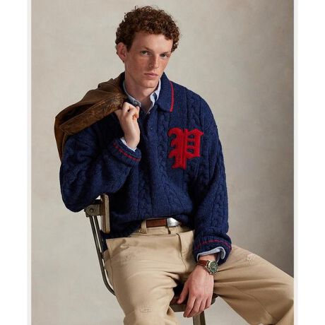 創業年にちなんだ67の刺繍入りのシェニール糸の文字のパッチをあしらったケーブルニットセーター。ウール、コットン、アルパカウール、リネンで紡いだ太いゲージの糸を使用し、編み込みケーブルモチーフを施したアイテム。・レギュラーフィット:胸囲に余裕を持たせつつ、モダンなシルエットを維持・コントラストティップを施したリブニットのポロカラー / 2つボタンの前立て / コロゾボタン・長袖 / コントラストティップを施したリブニットのカフス・左胸にシェニール糸のPパッチと67の刺繍・リブニットの裾・モデル身長185cm、着用サイズM※商品の色味は、光のあたり具合など諸条件により色感が多少異なって見える場合がございますので予めご了承下さい。 【素材】・本体:毛 34%、綿 33%、アルパカ 20%、麻 13% 装飾部分を除く【生産国】中国