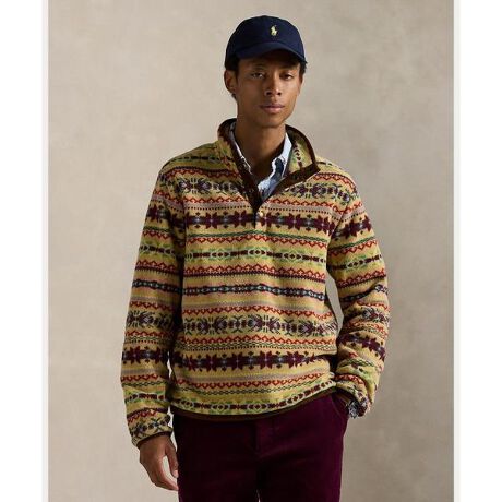 ブラッシュ加工のフリースで仕立てたプルオーバー。柔らかな色合いのパレットであしらったフェアアイル風のプリントが特徴。フェイクスエードのトリムを施し、質感のコントラストをプラス。・モックネック / スナップ付きクォータープラケット / 襟と前立ての内側にフェイクスエードのトリム / 特別に開発したRalph Laurenのロゴ入りメタルスナップ・長袖 / カフスにフェイクスエードの縁飾り・ドローストリング付きの裾にフェイクスエードの縁飾り・右カフスの上にシグネチャーのポニー刺繍。・モデル身長185cm、着用サイズM※商品の色味は、光のあたり具合など諸条件により色感が多少異なって見える場合がございますので予めご了承下さい。※注意:柄の配置は、商品によって異なります。 【素材】・本体:ポリエステル 100% 皮革部分:合成皮革【生産国】カンボジア
