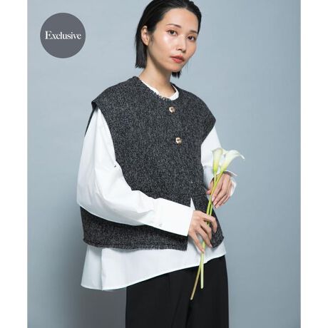 上質なツイード素材を使用した、温もりとモード感を併せ持つショートベスト。細やかに織り上げたツイードならではの豊かな表情に、衿ぐりと裾のフリンジがさりげないアクセントを添えます。丸みを持たせたワイドシルエットは、ゆったりとしながらもショート丈のため、全体はコンパクトにまとまり、今季らしいバランスの着こなしが叶います。フロントにあしらったゴールド調のボタンが、装いにほどよい華やかさをプラス。レイヤード次第で、きれいめからカジュアルまで幅広く活躍する一着です。