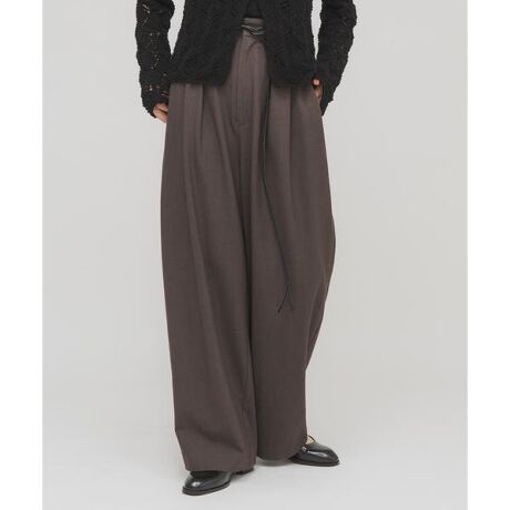 きちんと感とモードさを兼ね備えた、さりげない杢調がポイントのスラックス。ベルトループが一癖あるデザインになっており、取り外し可能なベルトが付いています。少しカーブしたようなシルエットはかっちりとし過ぎずこなれ感を叶えます。同素材のノーカラーデザインジャケット(KB26130-2075020)とセットアップで着ていただけます。