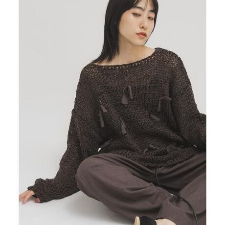 ペーパータッチが特徴的なテープヤーンで編んだ、軽い着心地のニット。身頃にランダムに散りばめられたリボンがデザインポイントになっています。身体のラインを拾い過ぎないオーバーサイズながらも、すっきりとした首元は抜け感を叶えます。どんなボトムにも合わせやすいカラーをご用意しました。