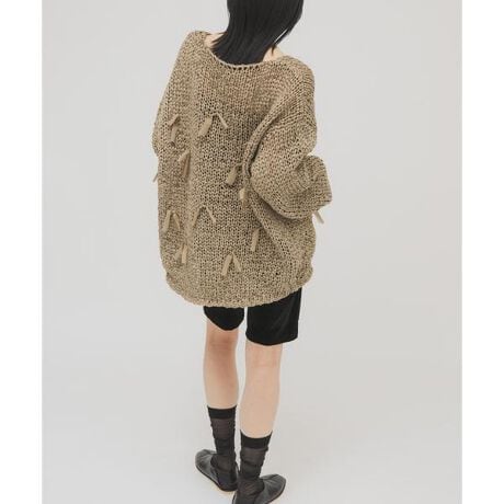 ペーパータッチが特徴的なテープヤーンで編んだ、軽い着心地のニット。身頃にランダムに散りばめられたリボンがデザインポイントになっています。身体のラインを拾い過ぎないオーバーサイズながらも、すっきりとした首元は抜け感を叶えます。どんなボトムにも合わせやすいカラーをご用意しました。