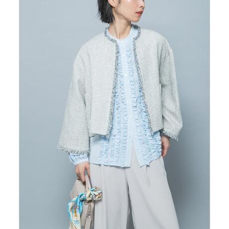 キュプラ裏地やグログランテープ始末で高級感を演出し、ツイードならではのフリンジディテールを細部に施したこだわりのデザイン。太さの違う数種類の糸使いは立体感があり、カジュアルさもプラスしてくれます。ゆったりとした身幅×ショート丈で着るだけで今年らしいバランスに◎ブラウスからワンピースなど幅広いアイテムを合わせていただける汎用性の高いアイテムで、デニム合わせのカジュアルダウンしたスタイリングもおすすめです。