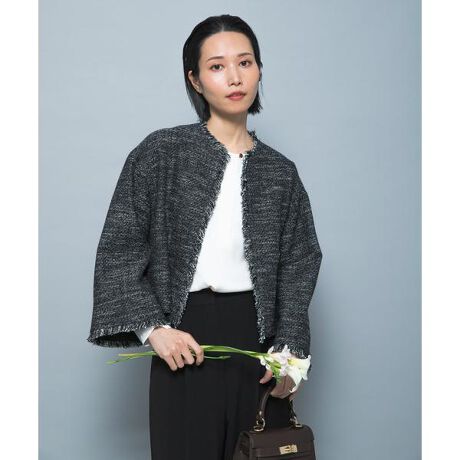 キュプラ裏地やグログランテープ始末で高級感を演出し、ツイードならではのフリンジディテールを細部に施したこだわりのデザイン。太さの違う数種類の糸使いは立体感があり、カジュアルさもプラスしてくれます。ゆったりとした身幅×ショート丈で着るだけで今年らしいバランスに◎ブラウスからワンピースなど幅広いアイテムを合わせていただける汎用性の高いアイテムで、デニム合わせのカジュアルダウンしたスタイリングもおすすめです。