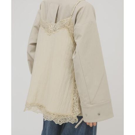 サテンキャミソールにレーステープを施したトレンドアイテムが登場。肩紐はアジャスターが付いているので、チュニック丈にすることも可能です。身体のラインを拾い過ぎないサイジングや、サイドスリットもポイント。メイン使いはもちろん、ゆるっとしたスウェットやニットの中に着ていただいたリラクシーなスタイリングがおすすめです。