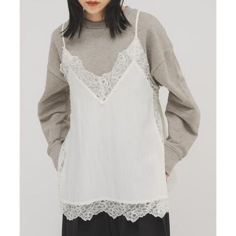 サテンキャミソールにレーステープを施したトレンドアイテムが登場。肩紐はアジャスターが付いているので、チュニック丈にすることも可能です。身体のラインを拾い過ぎないサイジングや、サイドスリットもポイント。メイン使いはもちろん、ゆるっとしたスウェットやニットの中に着ていただいたリラクシーなスタイリングがおすすめです。