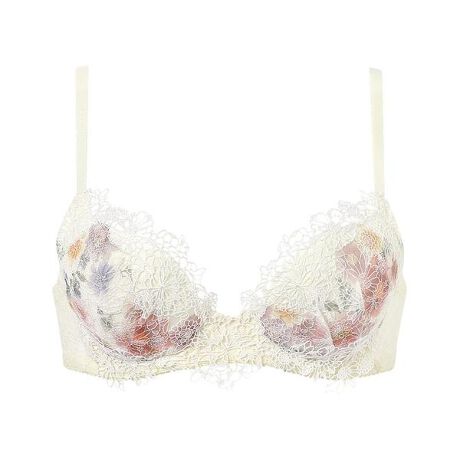 ●自分に合わせて、胸の谷間をきれいにととのえる前中心の低いワイヤーを使い、脇寄せを強くすることで、胸の谷間を美しく見せる●サイズに合わせたバストメイクを<(B〜D)カップ/(E)65〜75サイズ>…ピタッとパッドでボリュームアップ<(E〜I)カップ>…サイドパネルでシルエットすっきり<(E・F)80・85サイズ/(G〜I)カップ>…下カップのボーンでバストをささえる※サイズによっては柄やアップリケの位置、デザインが異なる場合があります。カップにほどこされたレトロポップな花柄のケミカルレースが贅沢なデザイン。繊細な細番手の糸を使ったインケミカルレースが透明感を演出。土台はケミカルアップリケとラッセルレースを組み合わせて、モダンでかわいらしさもある仕上がりに。WH・YEカラーにはプリントをあしらい、華やかさを一層引き立てました。バックストラップの付け根にあしらったレースが可憐さをプラス。細やかで美しいレースに心躍る一枚です。