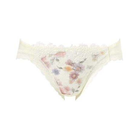 [型番:PXD125]●やわらかいはきごこち バックはやわらかく伸びるベア天竺素材で、はきごこちがよい・フロントは裏打ち付きで透けにくいフロントにほどこされたレトロポップな花柄のケミカルレースが贅沢なショーツ。細番手の糸を使ったインケミカルレースが透明感を演出します。WH・YEカラーにはプリントをあしらい華やかさを一層引き立てました。前ウエストのレースが肌に重なり、浮き立つ繊細な模様が印象的な一枚。