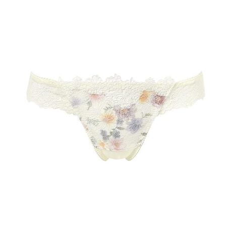 ●ひびきにくい バックは総レース仕様でアウターにひびきにくい・フロントは裏打ち付きで透けにくいフロントにほどこされたレトロポップな花柄のケミカルレースが贅沢で華やかなTバックショーツ。細番手の糸を使ったインケミカルレースが透明感を演出。WH・YEカラーにはプリントをあしらい、華やかさを一層引き立てました。前ウエストのレースが肌に重なり、浮き立つ繊細な模様が印象的。バックはあえてシンプルな総レース仕様で細めのTバックにすることで、レースから透ける肌とヒップが美しく見えるデザインに仕上げました。