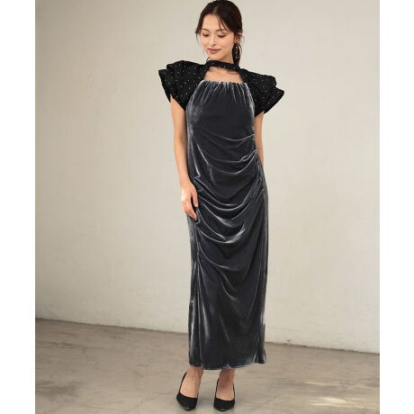 ドットバルーンスリーブ×ドレープベロアロング丈ワンピースパーティードレス