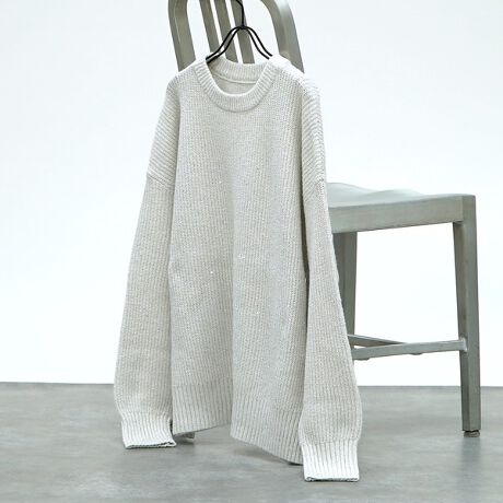 少しザックリな編地で柔らかく気軽に着やすい化繊のニット。スパンコールは派手過ぎず、メンズライクなデザインに対してさりげない女性らしさを演出してくれるのが魅力。