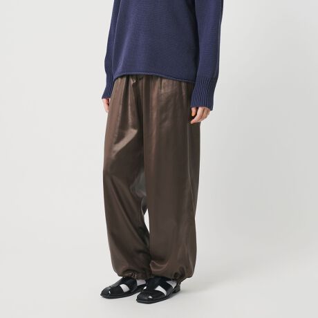 ゆったりとしたシルエットのカジュアルなパンツでありながら、落ち感とツヤのある陰影の美しい生地を使用し、大人な印象で着られる一着に仕上げました。