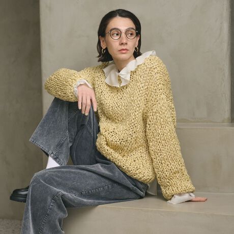 ざっくりとした編地を楽しめるニットは、ナチュラルなフェミニンスタイルからシャイニーなボトムを合わせたモードミックスの装いまで幅広く活躍します。