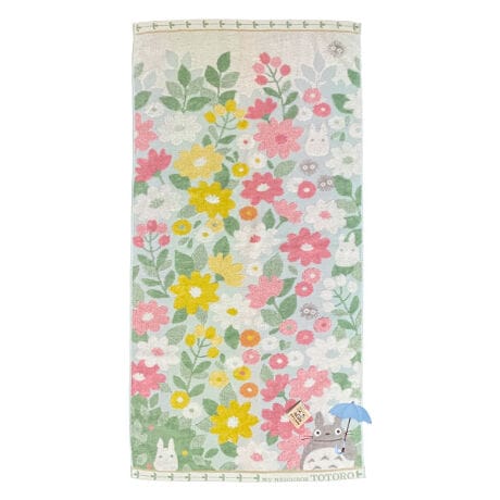 お花いっぱいの中に傘を差した大トトロと小トトロの姿のバスタオルです。色合いも優しく、さわり心地も柔らかいタオルです!