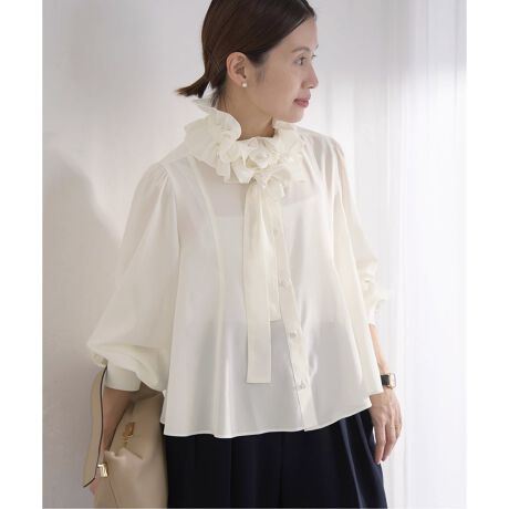 ボタンで取り外し可能なギャザーボウタイが華やかさを添え、オフィシャルなシーンをエレガントに彩ります。