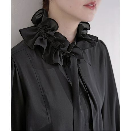 ボタンで取り外し可能なギャザーボウタイが華やかさを添え、オフィシャルなシーンをエレガントに彩ります。