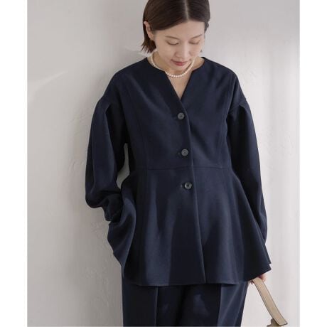メリハリのあるペプラムデザインが華やかさを添え、ブラウス以上・ジャケット未満のきちんと感と軽やかなカジュアルさを両立しています。