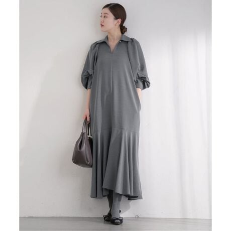 ギャザースリーブが華やかさを添え、身体のラインを拾わない女性らしい切り替えのフレアシルエットが美しく広がります。