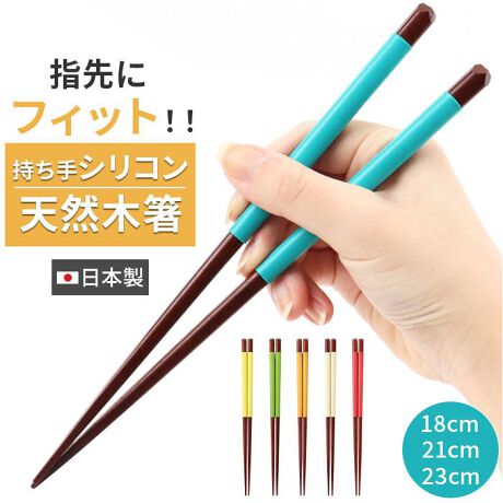【握りやすさ抜群】滑りにくい日本製天然木箸「SILICON WOODシリコン箸」。【シリコン持ち手】持ち手部分がシリコン製だから、手に優しくフィットして滑りにくく安定した使い心地◎【つまみやすい先角】箸先が角型に仕上げられているので、小さな食材もしっかりつかめて食事がスムーズ♪【サイズ展開豊富】23cm・21cm・18cmの3サイズがあるから、大人から子供まで家族全員で使える〇【漆塗りの上質感】天然木に漆塗装を施した美しい仕上がりで、毎日の食卓に上品な彩りを添える逸品。【日本製の確かな品質】国内で丁寧に作られているから、長く愛用できる耐久性と使い心地の良さを実現!