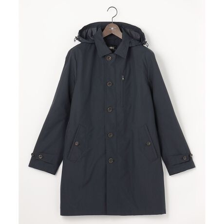 フードは衿裏のコンシールファスナーでスマートに着脱可能。取り外してもすっきりとした印象を保ち、2WAYの着こなしが楽しめます。シーンを選ばない定番のステンカラーデザインは、ビジネスからカジュアルまで幅広く対応。本水牛の焼き釦やウエストのスピンドルが、細部にまでこだわった上質感を演出します。肩はスプリットショルダー仕様で、着る人の体型に自然にフィットし、美しいシルエットをキープ。裏地にはオリジナルプリントを施し、見えない部分にも遊び心をプラスしました。