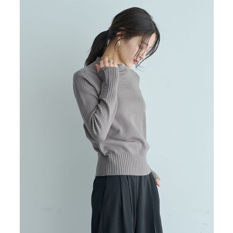 リブとボタンが際立つハイネックトップスハイネックとリブの組み合わせでクールな表情を作るニットです。肩線から続くリブが縦のラインを強調し、程よく引き締まったシルエットを叶えます。袖口には並んだボタンがあり、ボタンを外して抜け感を出すとこなれた印象に、留めるとモードなきちんと感を演出できます。柔らかな着心地と適度な厚みで季節の変わり目から真冬のレイヤードまで対応し、ボトムスを選ばずにコーディネートしやすい万能アイテムです。ケアのしやすさと飽きのこないデザインで長くお使いいただけます。透け感[なし]