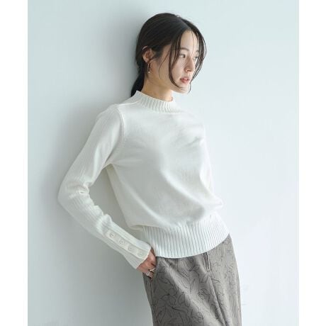 リブとボタンが際立つハイネックトップスハイネックとリブの組み合わせでクールな表情を作るニットです。肩線から続くリブが縦のラインを強調し、程よく引き締まったシルエットを叶えます。袖口には並んだボタンがあり、ボタンを外して抜け感を出すとこなれた印象に、留めるとモードなきちんと感を演出できます。柔らかな着心地と適度な厚みで季節の変わり目から真冬のレイヤードまで対応し、ボトムスを選ばずにコーディネートしやすい万能アイテムです。ケアのしやすさと飽きのこないデザインで長くお使いいただけます。透け感[なし]