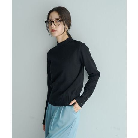 リブとボタンが際立つハイネックトップスハイネックとリブの組み合わせでクールな表情を作るニットです。肩線から続くリブが縦のラインを強調し、程よく引き締まったシルエットを叶えます。袖口には並んだボタンがあり、ボタンを外して抜け感を出すとこなれた印象に、留めるとモードなきちんと感を演出できます。柔らかな着心地と適度な厚みで季節の変わり目から真冬のレイヤードまで対応し、ボトムスを選ばずにコーディネートしやすい万能アイテムです。ケアのしやすさと飽きのこないデザインで長くお使いいただけます。透け感[なし]