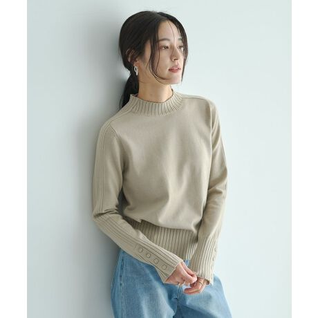 リブとボタンが際立つハイネックトップスハイネックとリブの組み合わせでクールな表情を作るニットです。肩線から続くリブが縦のラインを強調し、程よく引き締まったシルエットを叶えます。袖口には並んだボタンがあり、ボタンを外して抜け感を出すとこなれた印象に、留めるとモードなきちんと感を演出できます。柔らかな着心地と適度な厚みで季節の変わり目から真冬のレイヤードまで対応し、ボトムスを選ばずにコーディネートしやすい万能アイテムです。ケアのしやすさと飽きのこないデザインで長くお使いいただけます。透け感[なし]