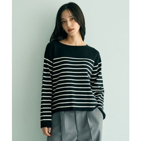 ボートネックが顔まわりをすっきりと演出しつつ、ネックレスやピアスなどを合わせたアクセサリースタイルも引き立てます。