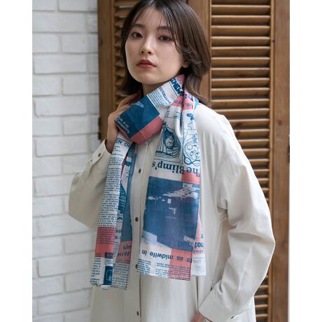 [型番:467U2001]英字新聞をモチーフにしたプリントストールです。GoldenBearの文字やクマのアイコンモチーフが隠れています。