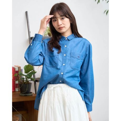 [型番:467U2331]4.5OZの薄くて軽いデニムシャツです。立体的な胸ポケットと程よいアタリ感でカジュアルな雰囲気に仕上げています。胸ポケットのGB刺繍がポイントです。