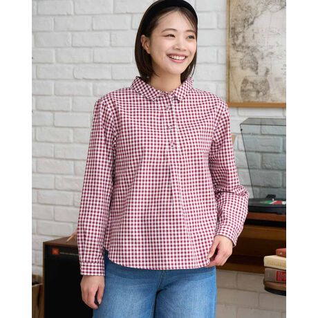 定番のギンガム柄のカジュアルブラウスに可愛らしさをプラスしたデザインに仕上げました。ボタンを上まで留めてきっちりとした雰囲気で着こなすのもおすすめです。