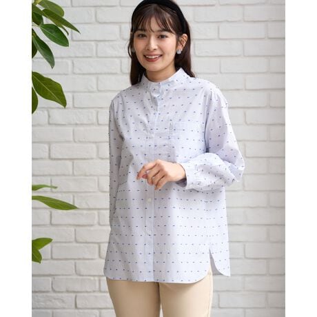 スタンドカラーで袖口はギャザーで膨らみをもたせています。