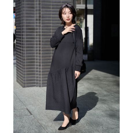 表裏ともにキメの整ったスムースに、ふくらみのある凹凸が映える膨れ織り調の素材を組み合わせた、表情豊かなワンピースです。