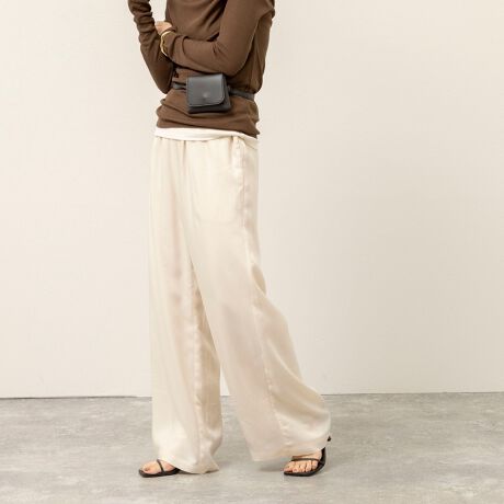 ・上品な光沢感が魅力のキュプラサテン素材のワイドパンツ