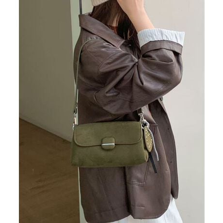 スエードタッチの柔らかな質感で、フラップとメタルパーツが甘すぎない大人可愛いデザイン。