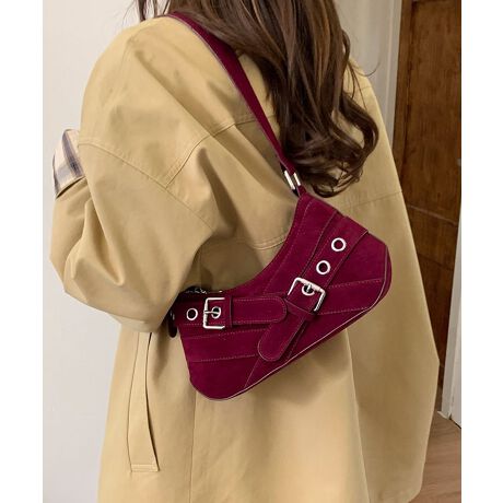 メタルバックルを大胆に効かせた飾りベルトが目を惹くY2Kライクなワンショルダーバッグ。
