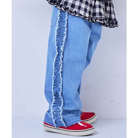 サイドにたっぷりとあしらったフリンジ風フリルが目を惹くバギーパンツ。