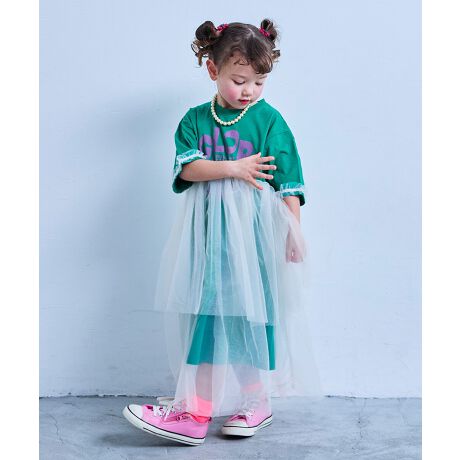 ロゴプリントワンピースにチュールスカートを重ねた、1枚でコーデが完成するドッキングデザインです。